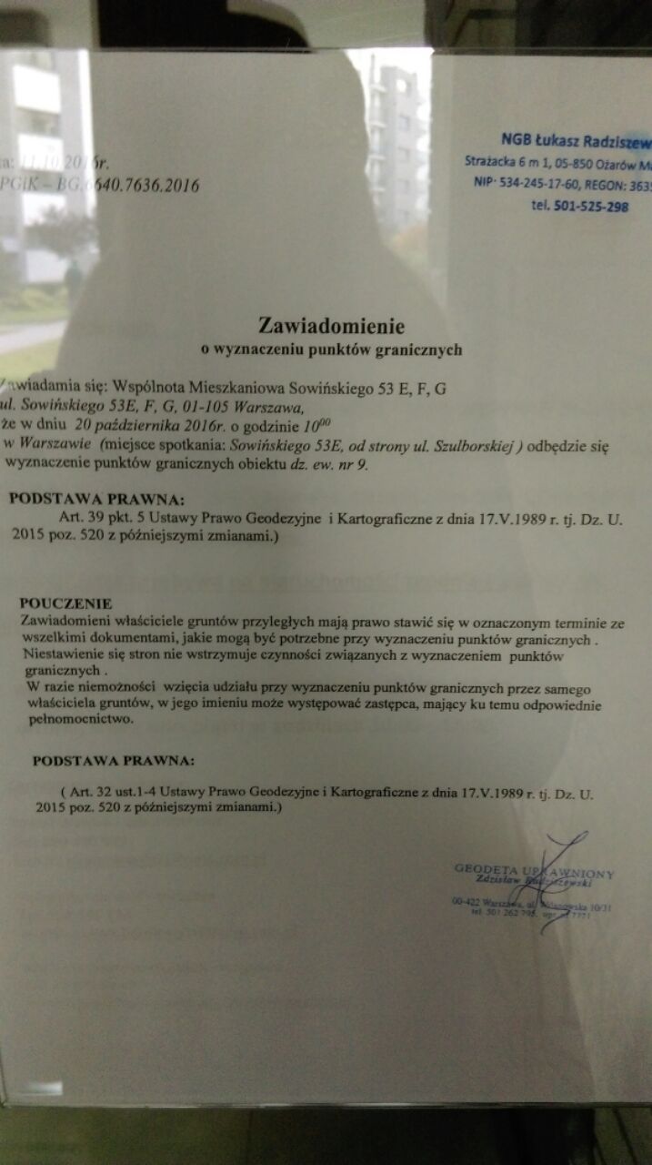 Beda wymierzac granice dzialki za 53E/F/G, ten lasek. Nie musimy byc obecni w czasie wymierzania. To taki wymog formalny, ze "sasiedzi" musza byc poinformowani o takich sytuacjach.