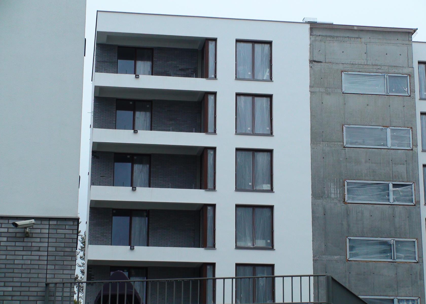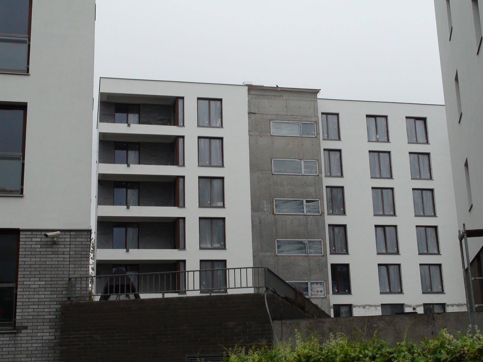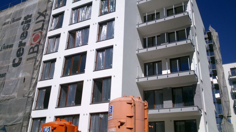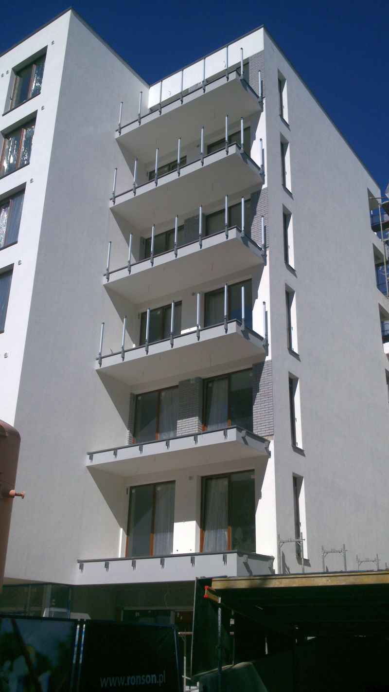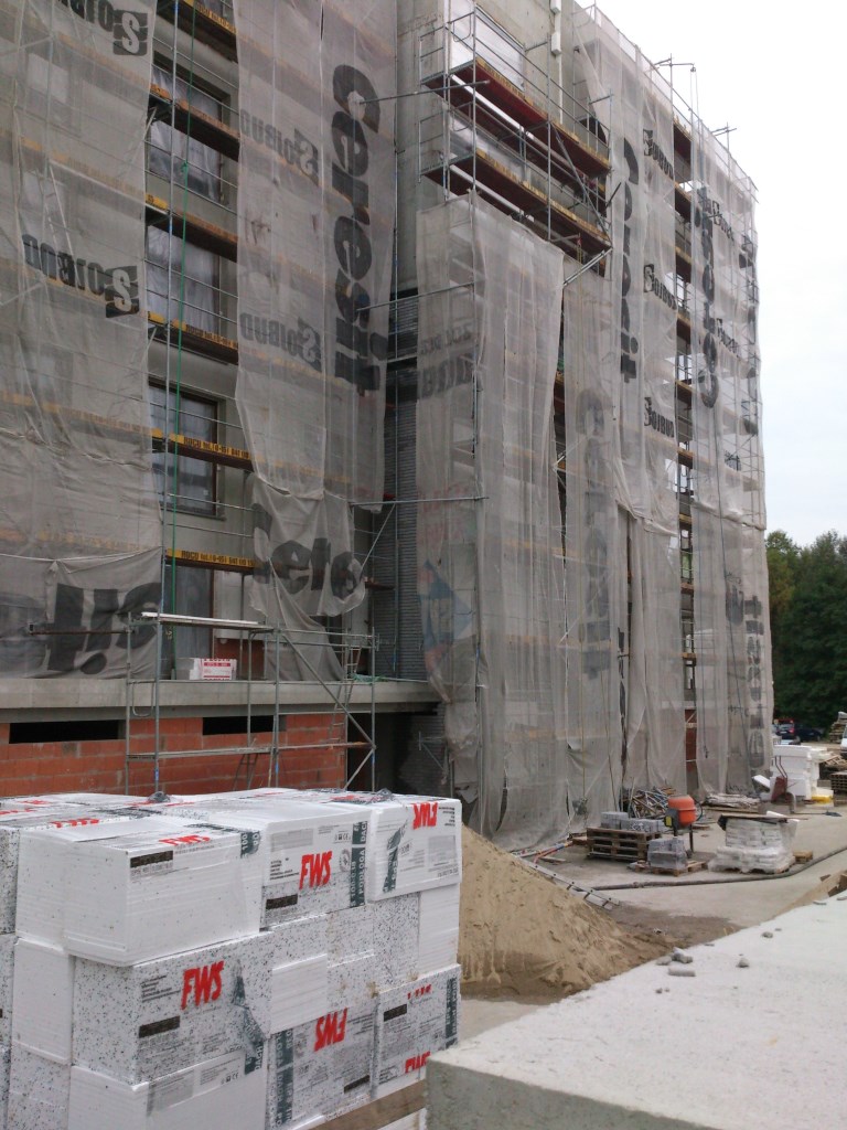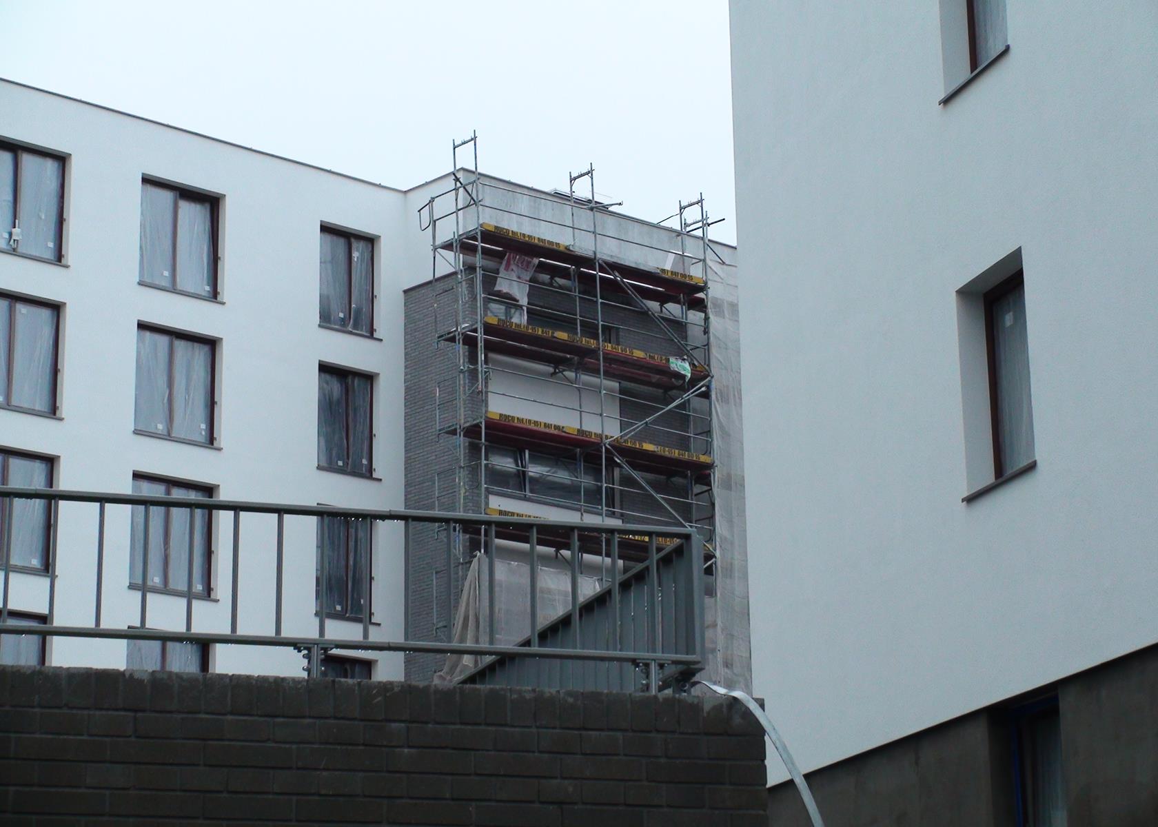 Stan prac na 14.09.13 od strony wewnętrznej osiedla, cegła pojawiła się na balkonach.