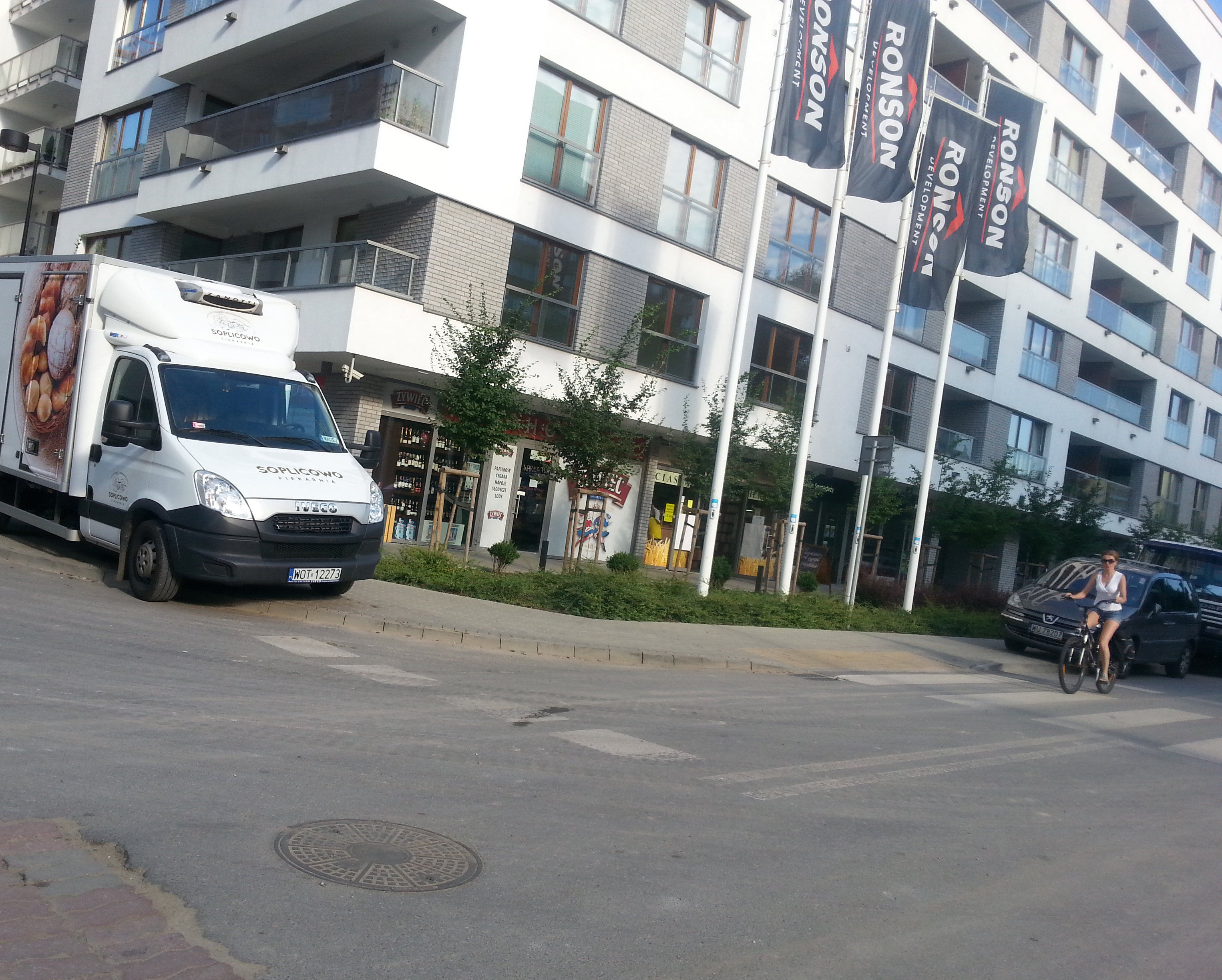 Przykład z dzisiaj, dostawa pieczywa. Tak jest codziennie rano, samochód staje na chodniku. Boję się sobie wyobrazić jak będzie się miała sytuacja przy tak dużym sklepie, gdzie nie ma miejsca do parkowania, codziennie kilka dostaw. Jestem absolutnie przeciwna jakimkolwiek układom. Pracuje w pobliżu Simply Market który znajduje się w bloku mieszkalnym, pod sklep codziennie zajeżdża po kilka tirów i samochodów dostawczych ale one przynajmniej mają gdzie stanąć...